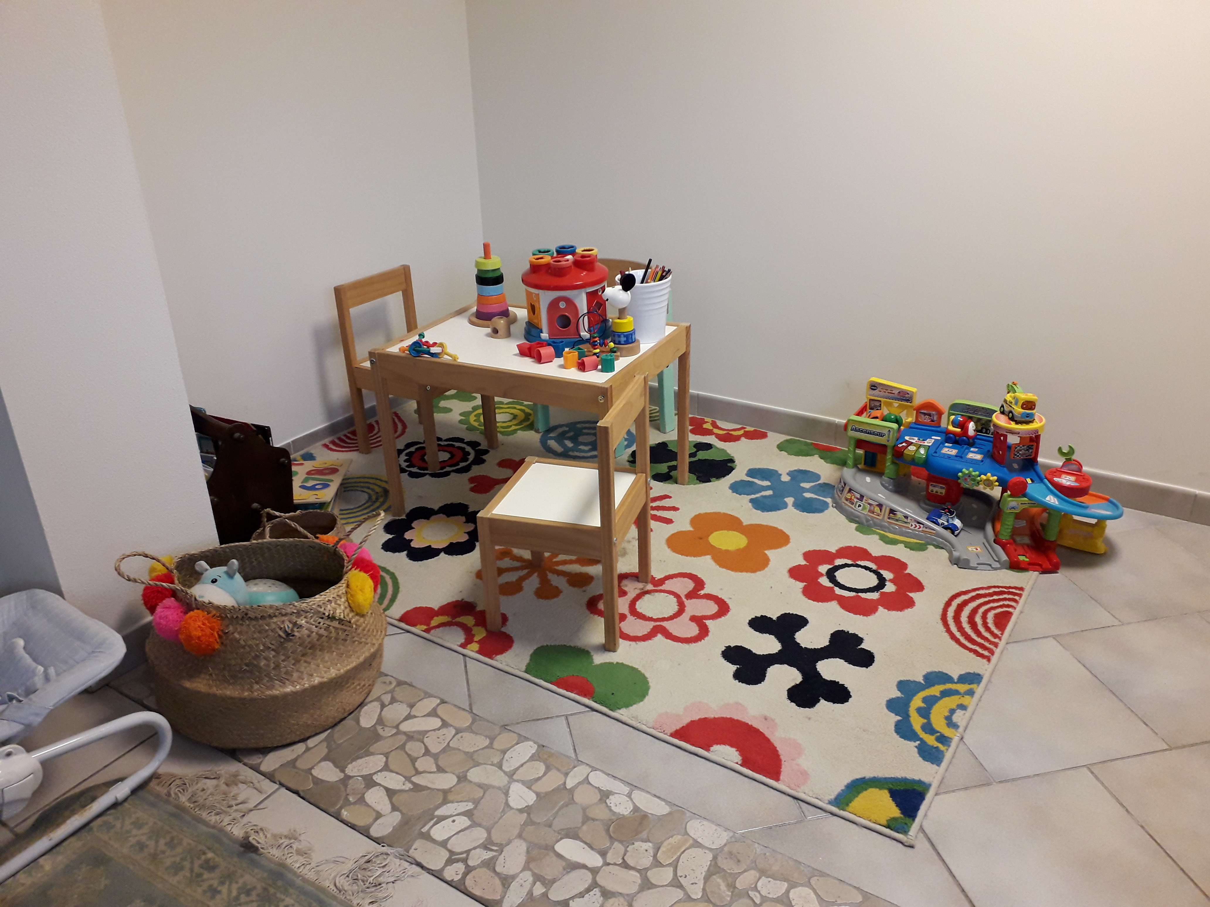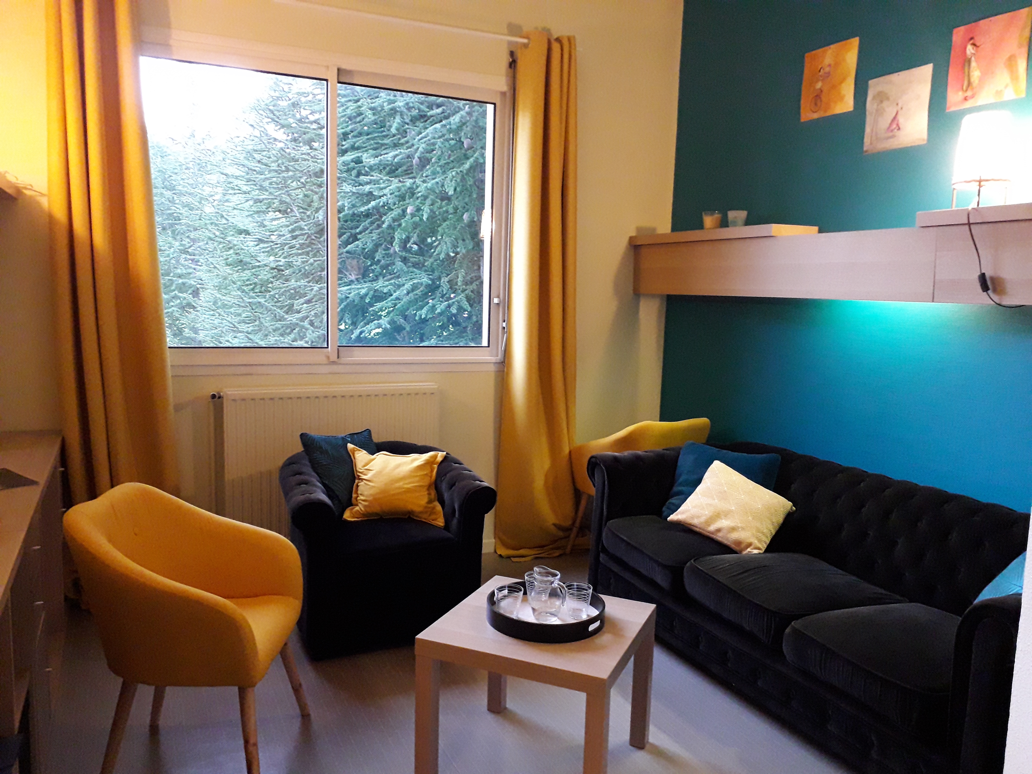 la salle d’attente est imaginée comme un espace de vie tranquille où vous pourrez pendant la séance de votre enfant ou à tout autre moment, prendre une boisson chaude, lire, vous détendre…